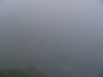 崖の上から海を望むとこの通り霧です。